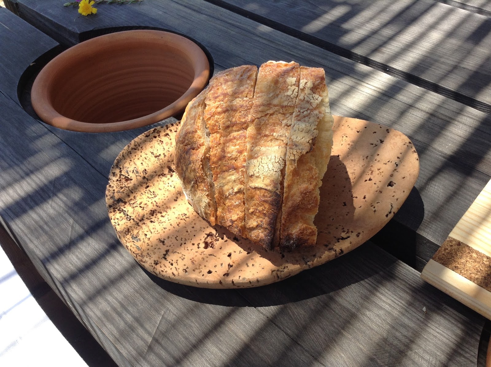 Chega o pão, a manteiga envelhecida e o azeite. Apoiados por bases em cortiça, o pão, madeira, a manteiga, e madeira e cortiça o azeite.