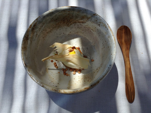 Como pré sobremesa leite de ovelha com pólen e trigo sarraceno. Tudo para dar errado para o meu lado. Detesto leite. Repulso ovelha. Odeio leite de ovelha. Mas deu tudo certo. Apresentado na forma de gelado, sabor suave e delicado, a contrastar com o crocante do pólen e do trigo.